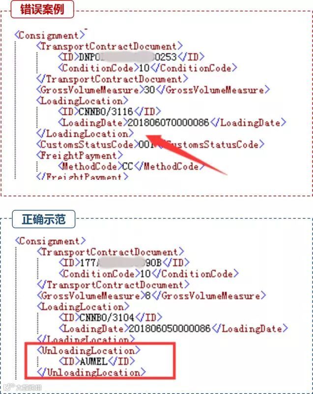 错误示范:必填项未填。系统退单提示:“21150 报文不符合填制规范,海关审核不通过,需要填写卸货地代码”、“ 21151 报文不符合填制规范,海关审核不通过,需要填写收货人名称”、“21152 报文不符合填制规范,海关审核不通过,需要填写发货人代码”、“21153 报文不符合填制规范,海关审核不通过,需要填写发货人联系号码”、“50004 请填写企业类型代码或国家代码!”