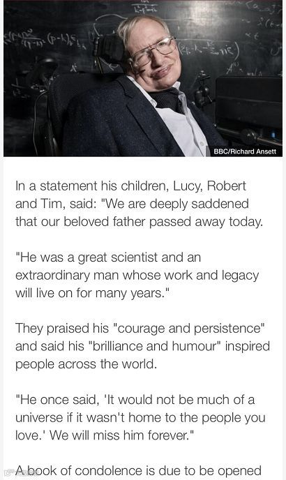 霍金的子女露西、罗伯特和蒂姆也在今日中午发表了相应声明:(如下)