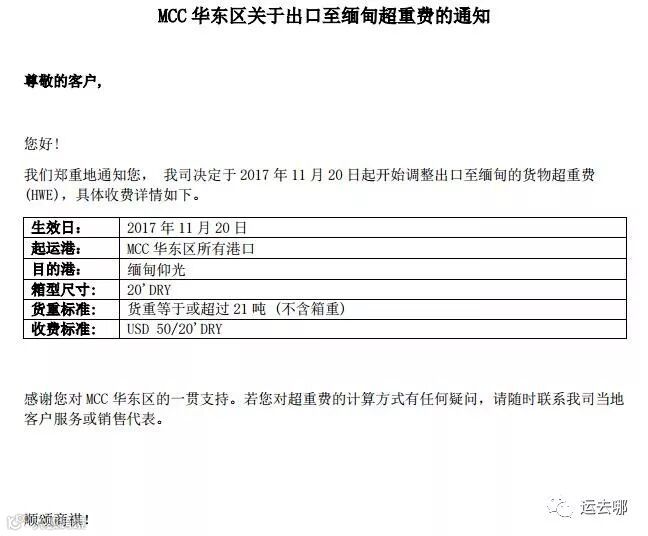 MCC通知于2017年11月20日起开始调整出口至缅甸的货物超重费 (HWE),具体通知如下: