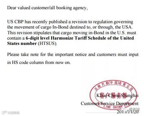 近日,美国总统轮船及川崎汽船接连发布通知,根据美国海关及边境保护局要求,自 2017 年 11 月 27 日起,所有入境及过境美国的货物均须提供商品海关关税编码(HTS Code)。
