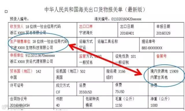 看报关单上“生产销售单位”是宁波XXXX生物科技有限公司,“境内货源地”是内蒙古其他,这就说明出口货物在国内的生产地、制造地或原始发货地在内蒙古地区。“生产销售单位”宁波XXXX生物科技有限公司如是自行出口货物的单位,宁波和内蒙古不在同一地区肯定不是自产货物,就要认真审查该报关单出口货物是否符合视同自产文件规定要求。