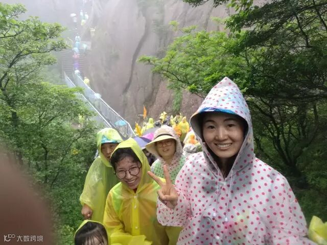 黄山之难爬天下闻名,很多地方都需要手脚并用才能爬上去。登山那天还下着连绵不断的雨,一会儿大家都累的满头大汗。穿着雨衣,淋着雨,出着汗,小伙伴们互相鼓励,彼此加油,一个都没有都没有落下。