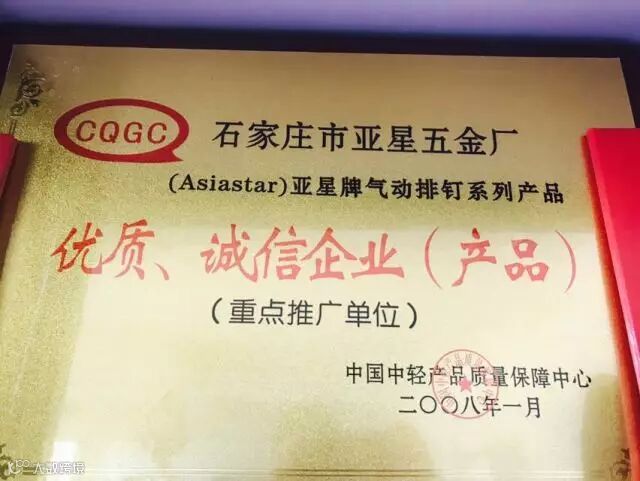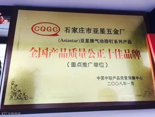 亚星牌汽动枪钉是唯一一家荣获“中国十佳品牌产品”的企业。自2006年先后荣获: