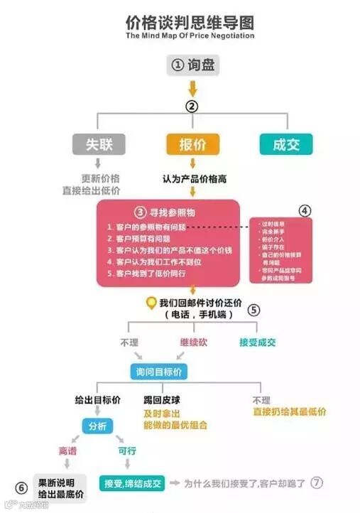 价格谈判技巧是一门很深的学问,你的第一次报价再低,采购商也会继续压价,这是套路,当进行价格谈判,和采购商周旋的过程往往是往复循环的,这期间无可避免的会经历:报价砍价,再报价再砍价不断循环。那如何在这个尽早结束这个循环,并在价格谈判的过程中占据一定优势?下面我们来看一张图!