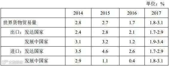 ;预计2017年全球贸易量增长1.8-3.1%,仍低于世界经济增速预期。