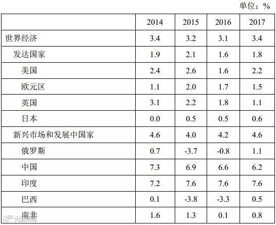 IMF预计,2017年世界经济增速有望回升到3.4%。其中,新兴经济体增长4.6%,发达国家增长1.8%。