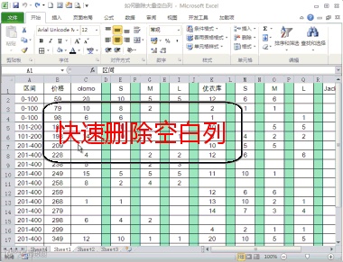 全选工作表→TAB键将光标移到空白列单元格→查找和选择→定位条件→行内容差异单元格→确定→格式→隐藏和取消隐藏→隐藏列→查找和选择→可见单元格→单击鼠标右键→删除。
