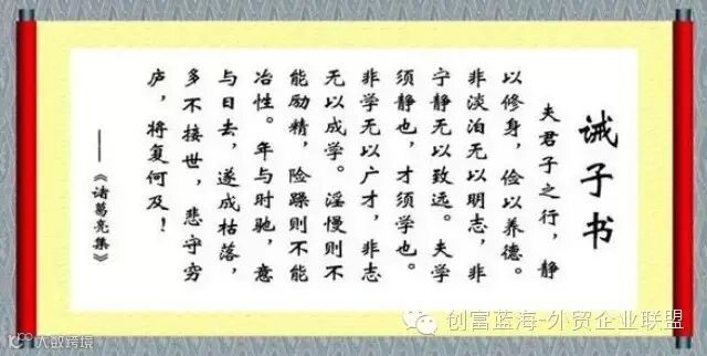 遂成枯落、多不接世、悲守穷庐、将复何及。诸葛亮忠告孩子时光飞逝,当自己变得和世界脱节,才悲叹蹉跎岁月,也于事无补。要懂得居安思危,才能够临危不乱。想像力比知识更有力量。你有没有从大处着想,小处着手,脚踏实地,规划是人生呢?