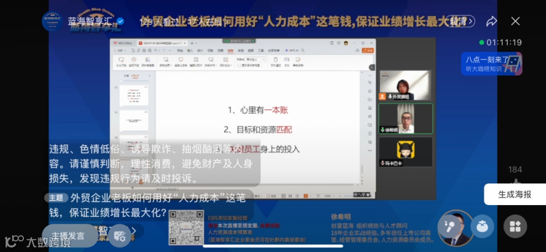 1月30日晚上8点,蓝海智享汇2024年第1次线上直播准时开启,依旧连线徐希明老师给大家带来《外贸企业老板如何用好“人力成本”这笔钱,保证业绩增长最大化?》专场直播。
