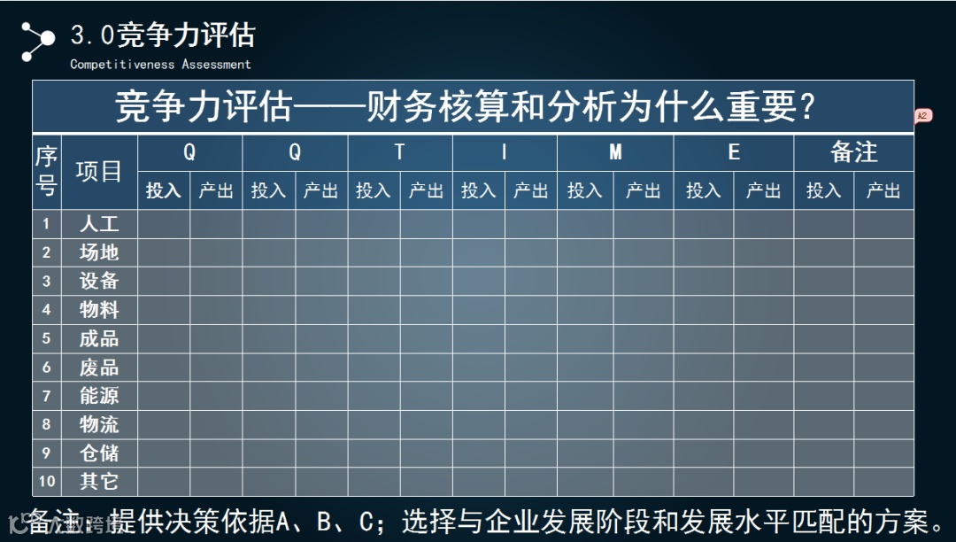课堂上,王老师给了一个模型QQTIME:从数量、质量、技术、潜力、方法、执行等6个方面,及人才、场地、设备、物料、成品、废品、能源、物流、仓储、其他等10个维度,教给各位企业家,如何自己替自己“诊脉”。