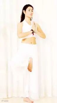 保持站立姿势,双手合十,放于胸前,右脚抬起,脚跟抵住会阴处,呼气吸气保持站立平衡。