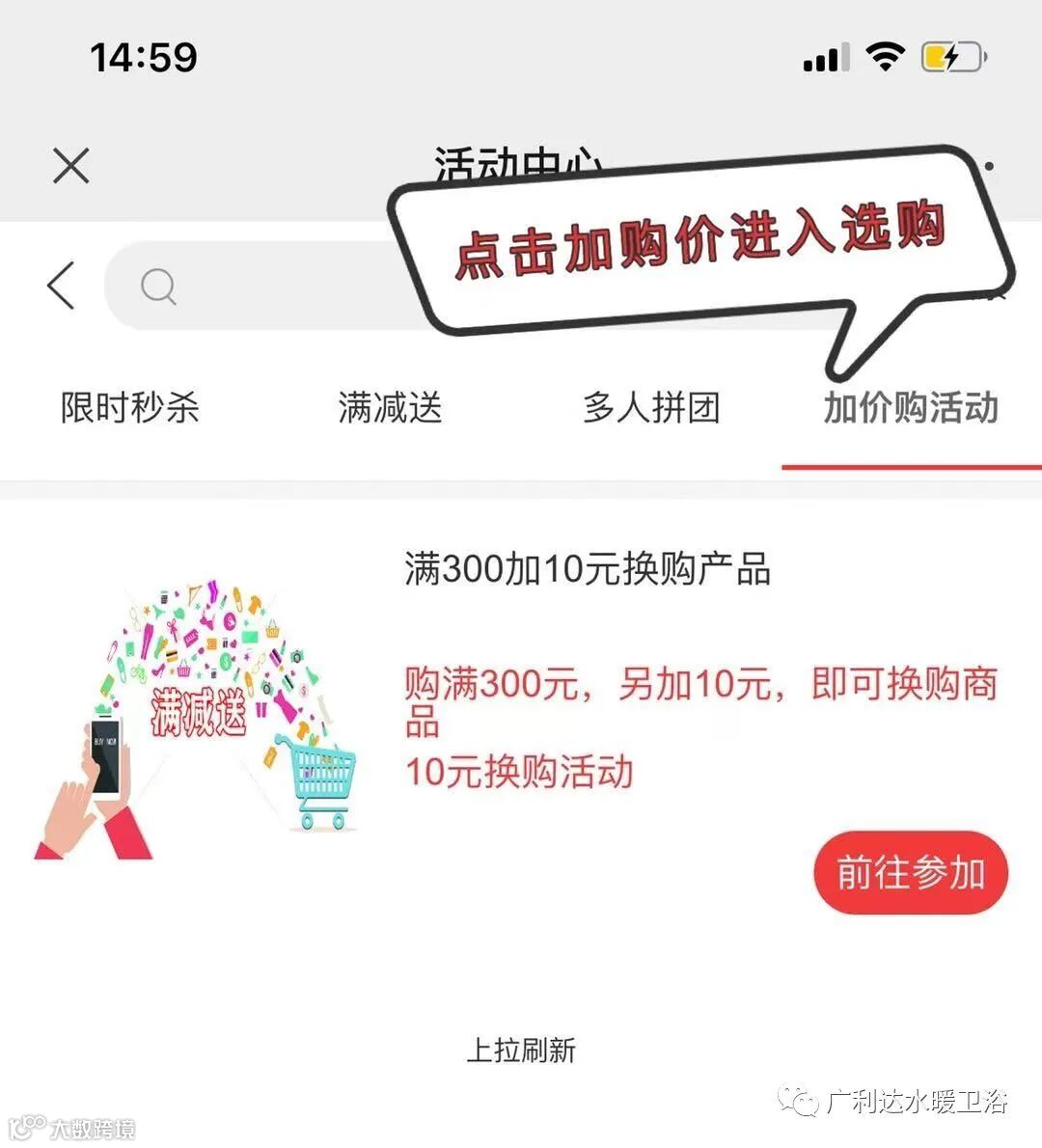 活动要求:在平台 “加购价” 里面指定产品买满300元 加9.9元换购任意一种商品(原价价值30元左右)