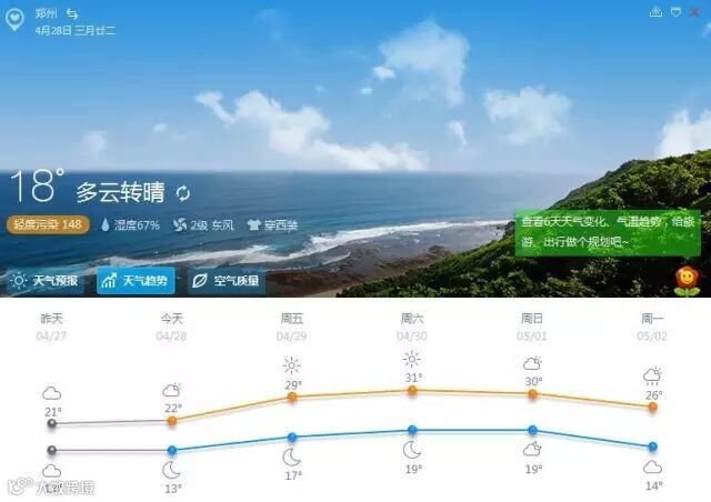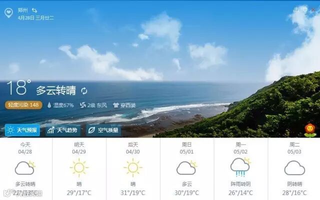 这种凉爽的天气不会一直这样持续下去,毕竟到春季的尾声,升温才是未来的趋势。今天,全省黄河以北和三门峡、洛阳、南阳、平顶山、郑州、开封、商丘七地区将受高空横槽影响有分散性雷雨,最高气温在21~23℃之间;其它地区以多云为主,最高气温在24℃左右。