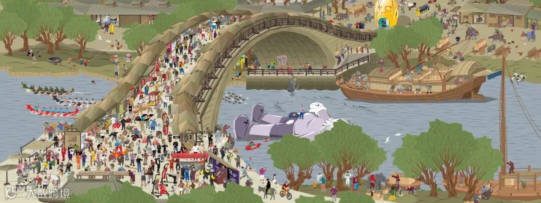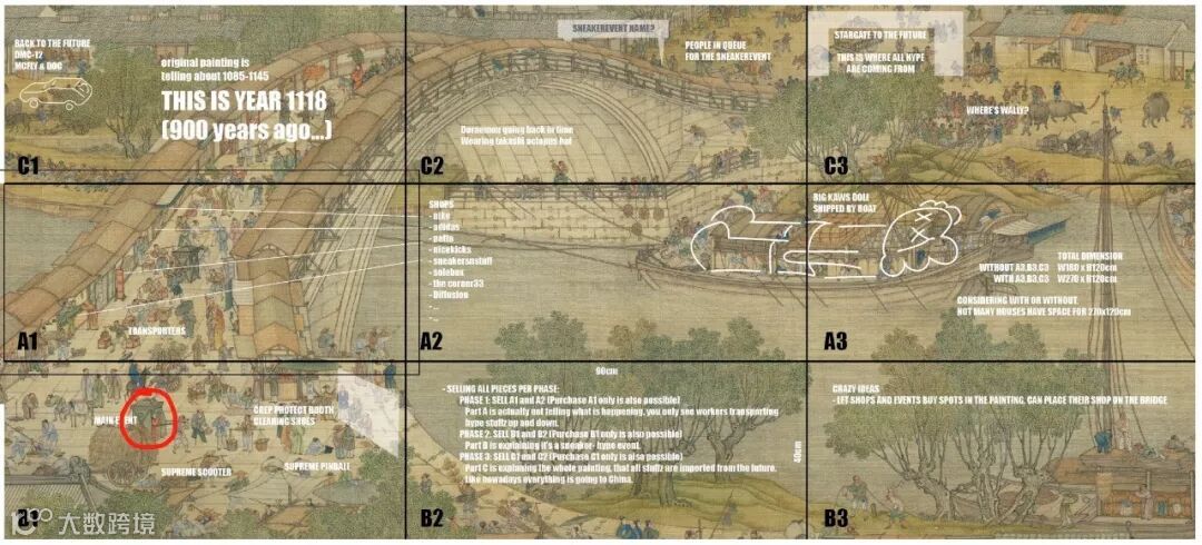 《The Cháo Dynasty》潮代只放大了原作者(张择端)总尺寸的0.06%。从上图起初的电子稿件我们不难看出WAY运用原画的古代元素和现代的潮流元素进行结合的方式进行创作,成品不仅仅是在潮流圈内轰动,也让更多业内人士惊叹。