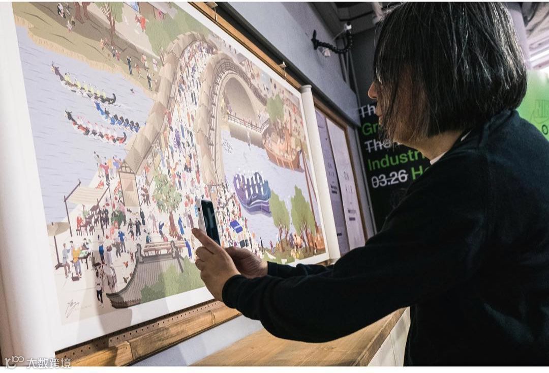 展览上的这幅画作是WAY在2018年耗时4个月超过1000小时完成的轰动潮流界的《The Cháo Dynasty》潮代。作品灵感来源于著名的《清明上河图》,图中所呈现的古装人物的穿着打扮,体现了WAY向影响到他自己人生的艺术家、动画、电影、时尚、品牌致敬。