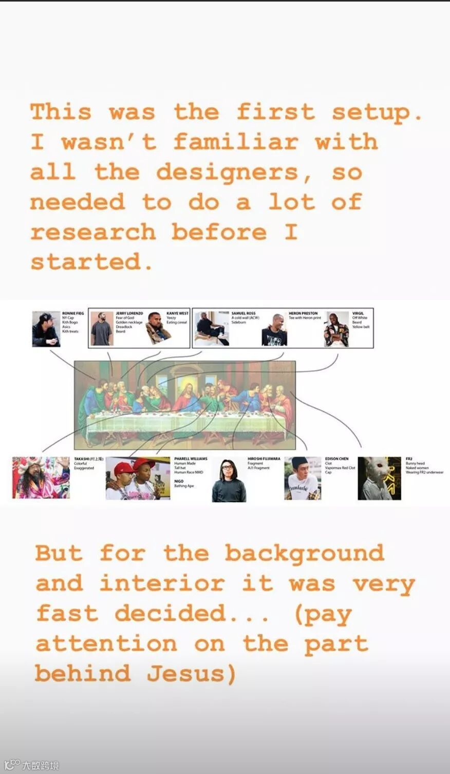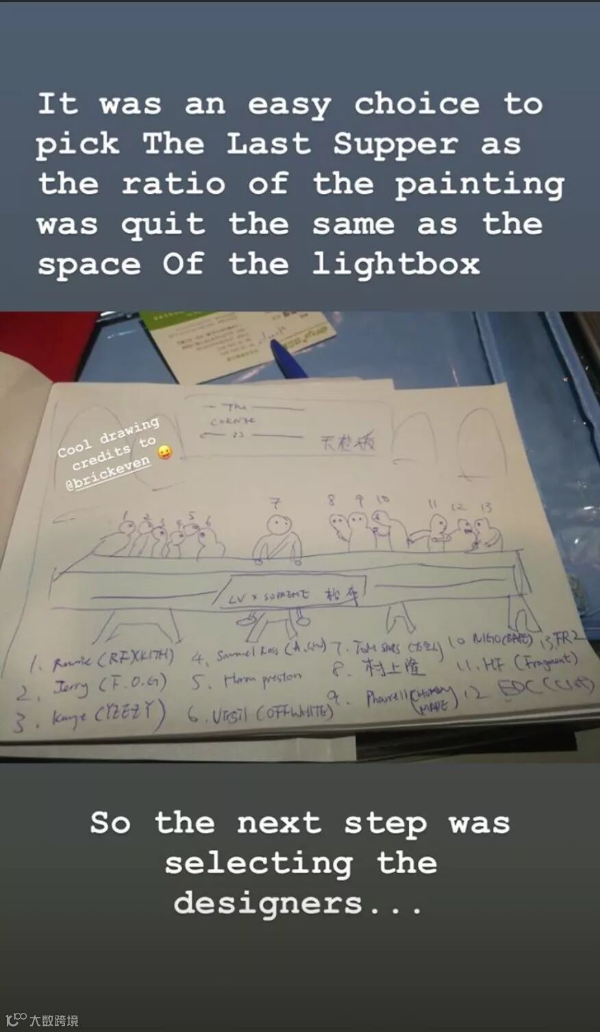 从WAY的手稿上确定出现在画中的人物名字来讲,不难看出他的精细策划和用心程度,所以最后呈现在世人面前的是成品在社交媒体上得到了很多人的关注,同时也得到了一些有影响力的人和设计者的认可。
