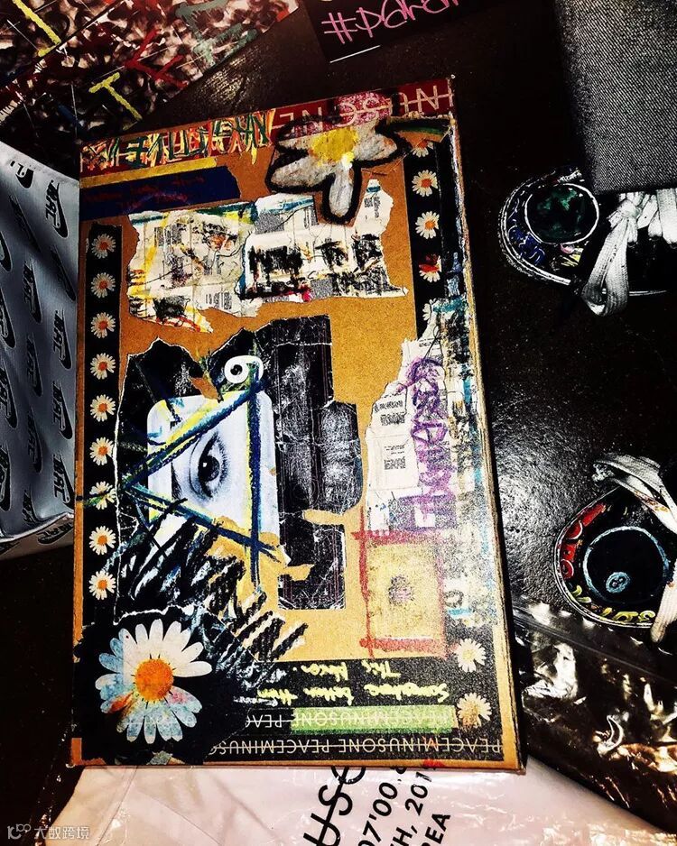 布满涂鸦的鞋盒上有雏菊和MADE IN KOREA字样等,鞋盒内部也铺满雏菊。