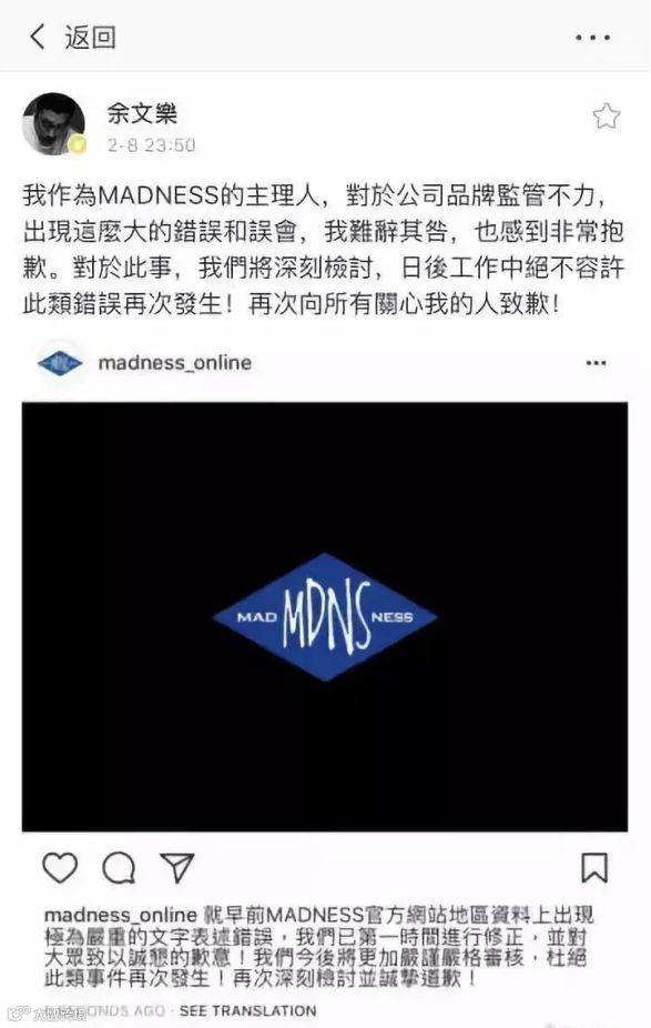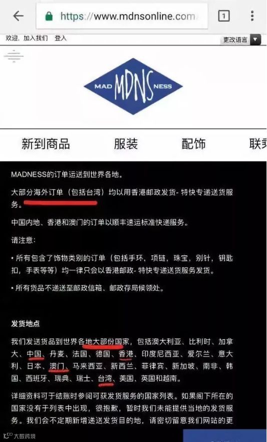 去年MADNESS 官网上新之时,被众多网友举报官网的发货说明把港澳台归到“国家”一类,即使官方迅速修改为“地区”但还是被留下证据了。