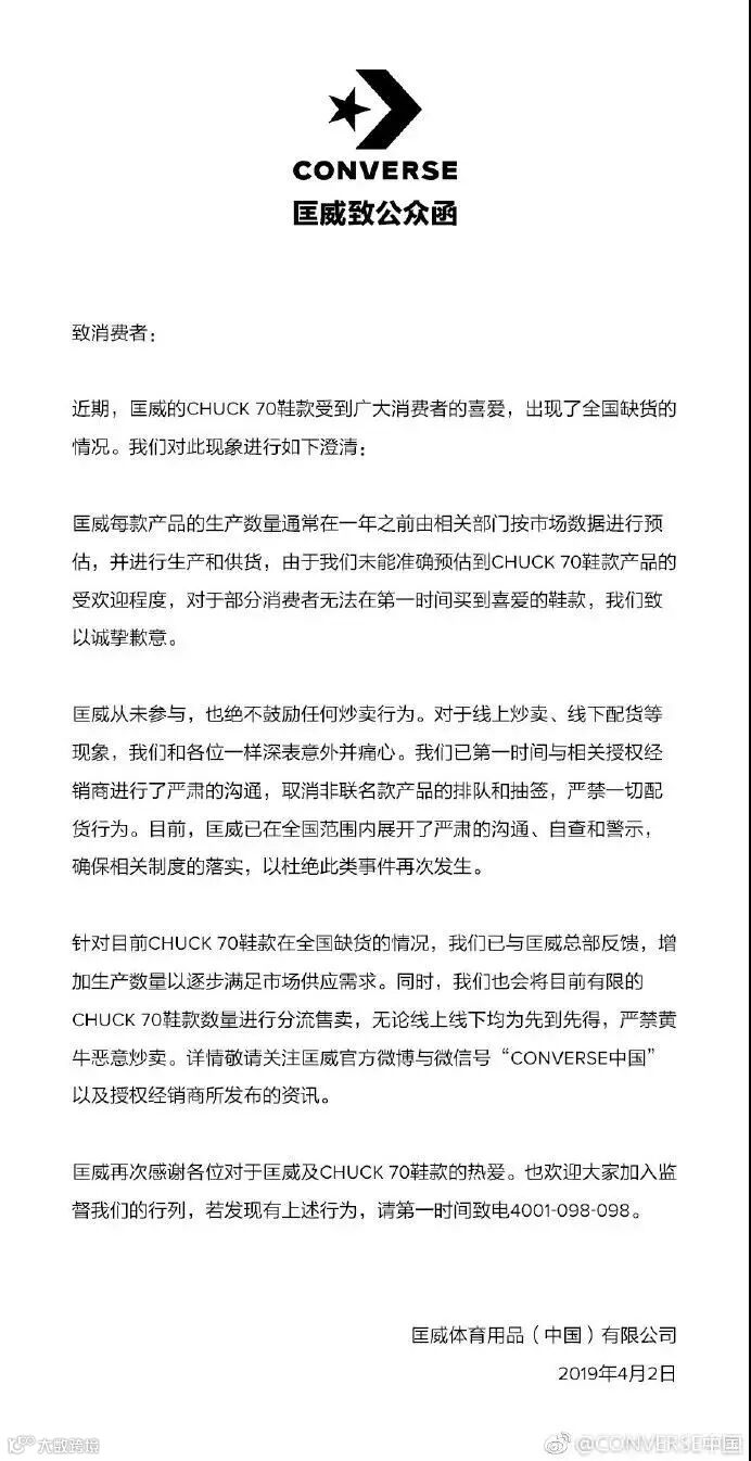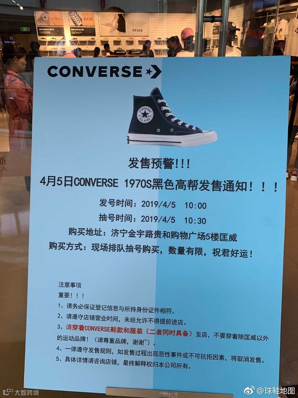 山东济宁某商场的匡威专柜对经典鞋款的发售方式引发热议。一副商家贴士显示,4月5号匡威1970黑色高帮采取发号抽号的方式,并要求穿着匡威鞋款和服装到店…发售贴士一宿之间放在网上争议不断。(是的…一股AJ的营销风味扑向而来)