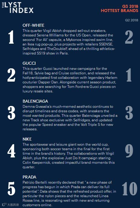 以下截取了前五位的排名,可见排名第一的是由Virgil Abloh 主理的 Off-White 。相比第二季度的排名,Off-White 超越了奢侈品牌 Gucci ,并且在总体上升了 33 位终于在2018年第3季度首次登上榜首位置,就连作为运动大牌的 Nike 和 YEEZY 分列第四和第七。