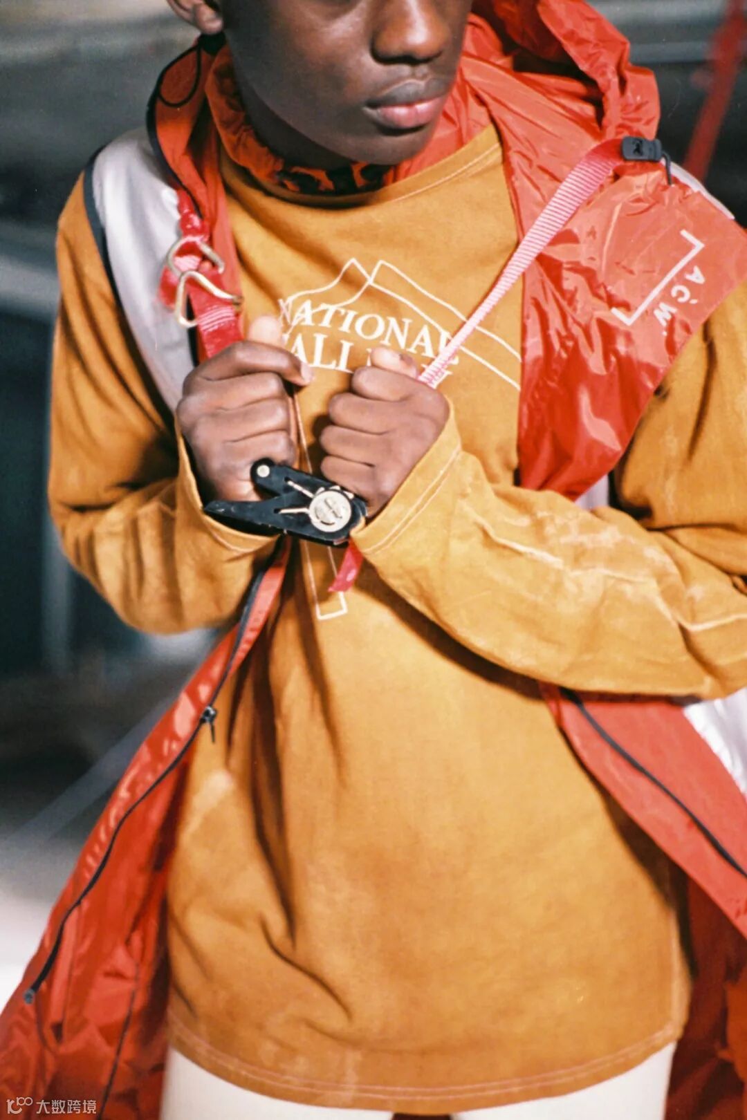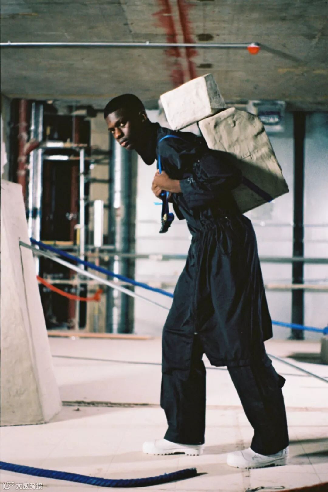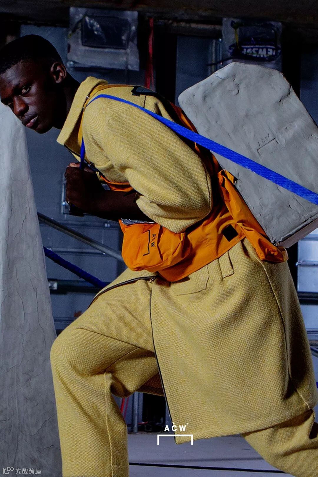 ▲ A-COLD-WALL* 2018 AW 系列-以反应工人阶级的服装设计为主轴,并将 PVC 材质、金属质感面料和机能绑带等细节注入其中增加未来气息,而颜色上也通过橙黄色调与黑灰色调营造冲突感。除此之外,模特身上的水泥方块装置则同时呼应了 A-COLD-WALL* 的品牌志向和对于文化的批评。