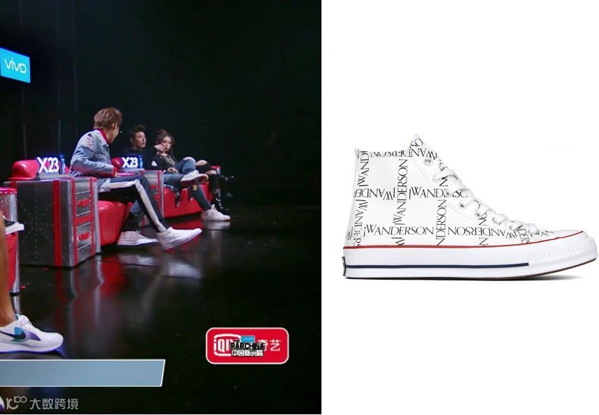 吴亦凡在本期上脚了两双鞋,这双鞋融合了 Converse 标志性的 Chuck 70 鞋款和 JW Anderson 的满印 Logo 设计,通过新鲜的构造性文字无限循环,呈现出与众不同的多样性。热狗在本季中也上脚过黑色版本的哟。