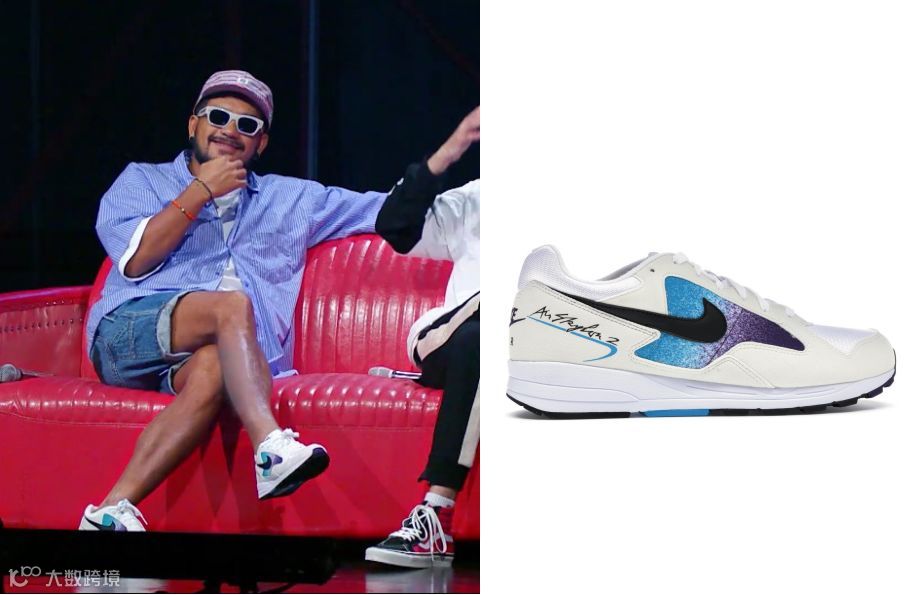 张震岳本期上脚了一双很小众又不贵的鞋,鞋面主体由浅卡其色麂皮和白色织物打造,鞋身中部织物加入炫彩渐变喷墨效果。蓝紫渐变,十分夺目。