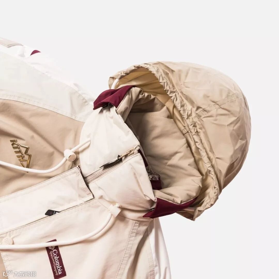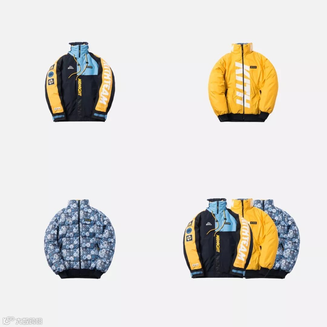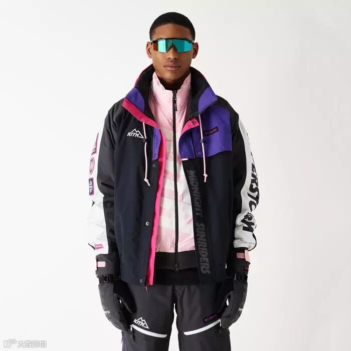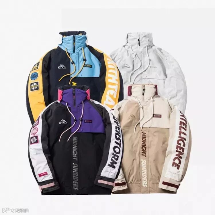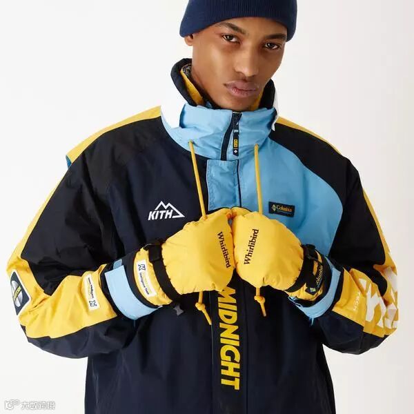 设计上采用拼接色块的方式,选用了 Kith 一贯鲜艳却不夺目的配色方案,色彩协调且凸显了运动、街头美感。搭载户外品牌 Columbia 打造的功能性版型,整体极具冲击美感。