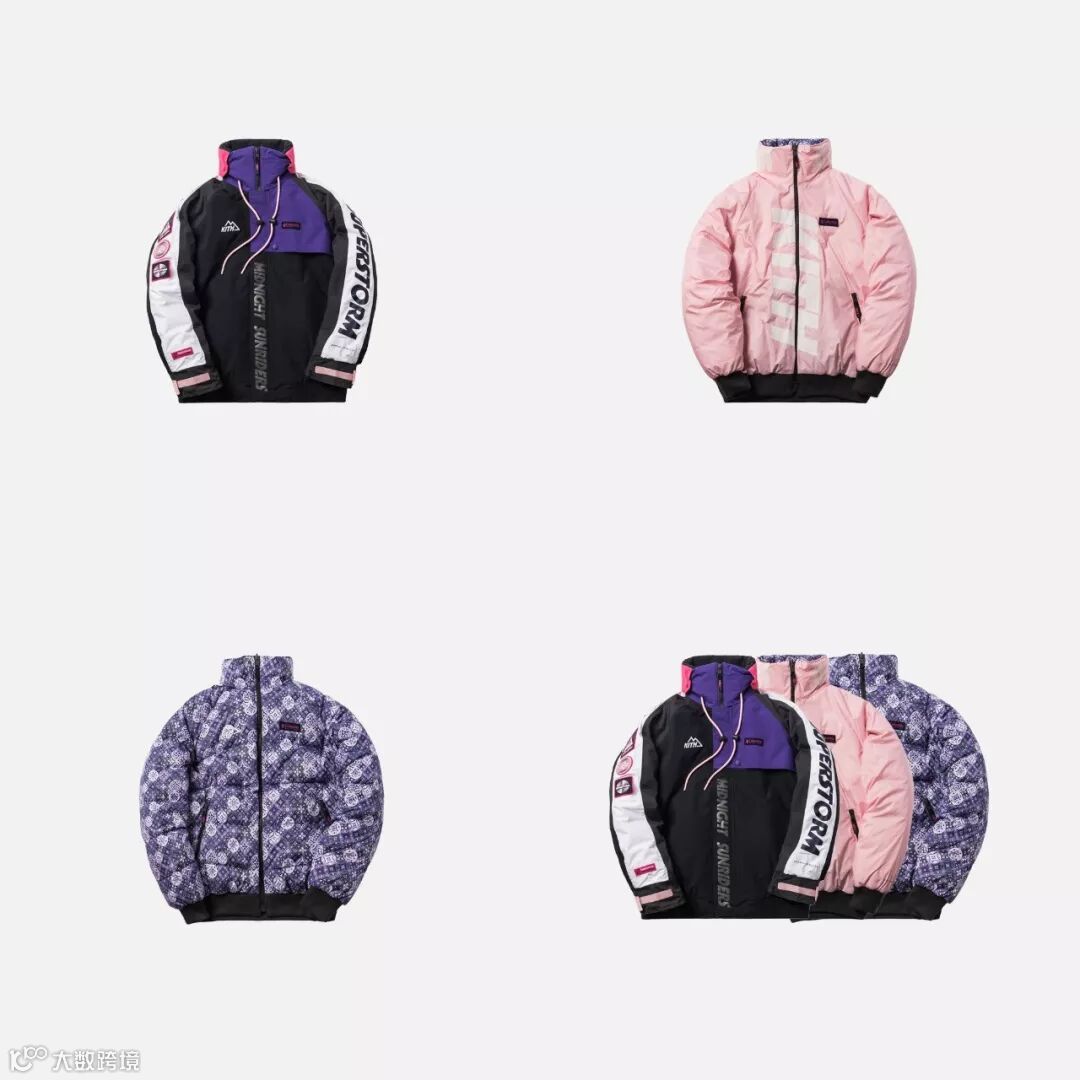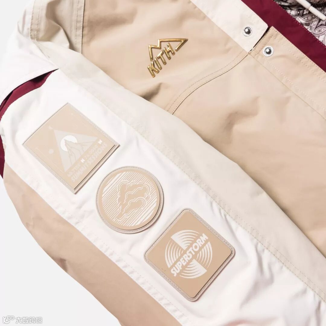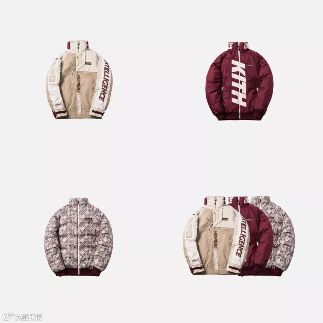 设计上采用拼接色块的方式,选用了 Kith 一贯鲜艳却不夺目的配色方案,色彩协调且凸显了运动、街头美感。搭载户外品牌 Columbia 打造的功能性版型,整体极具冲击美感。
