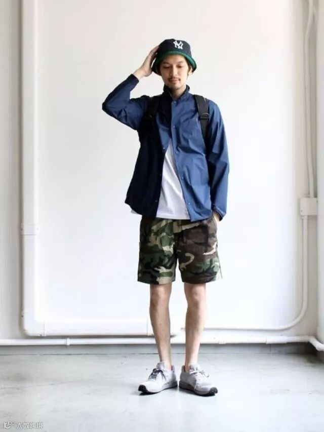 这个搭配其实比较常见,蓝色系衬衣内搭白色T恤,但因内外搭都是纯色,下身若再来一件纯色裤子就未免太过朴素,所以这身是选择了迷彩短裤+运动鞋,搭配一顶渔夫帽,休闲但不随意。