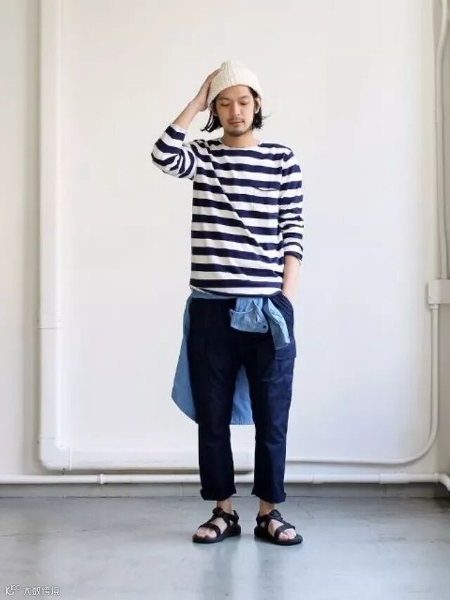 作为很容易穿成监狱风云的单品,横条纹Tee加上衬衫系腰,层次感立马就出来了,搭配凉鞋是整个穿搭的亮点,整体素色为主,简约而不普通。