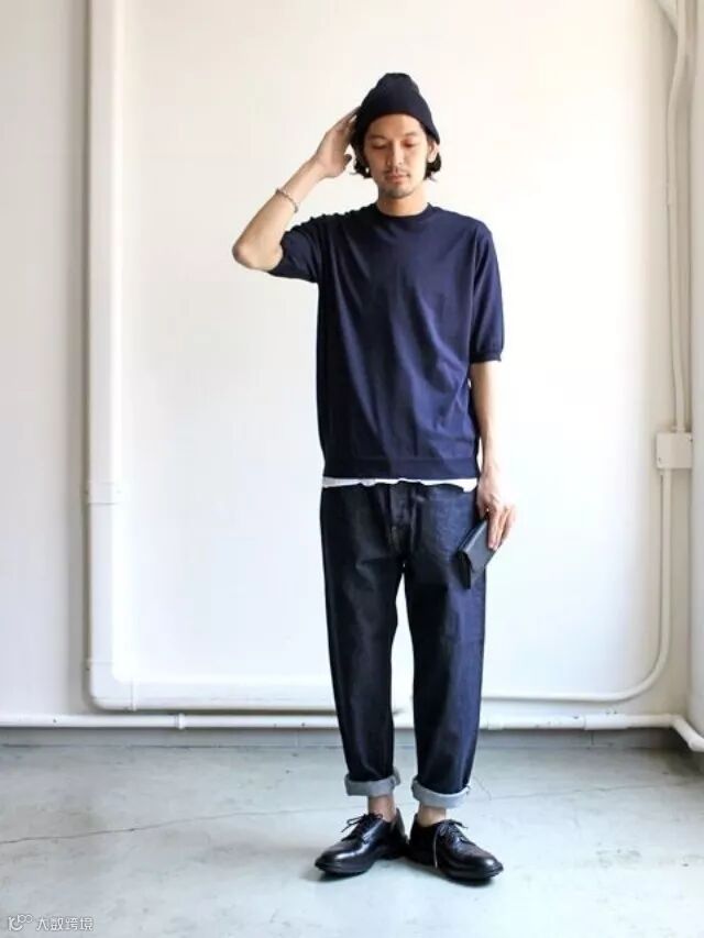 宽松和叠穿是本套「盐系」穿搭的精髓,卷裤腿露出纤细脚踝,整体配色藏青+黑+白,简单大方,气质满分。
