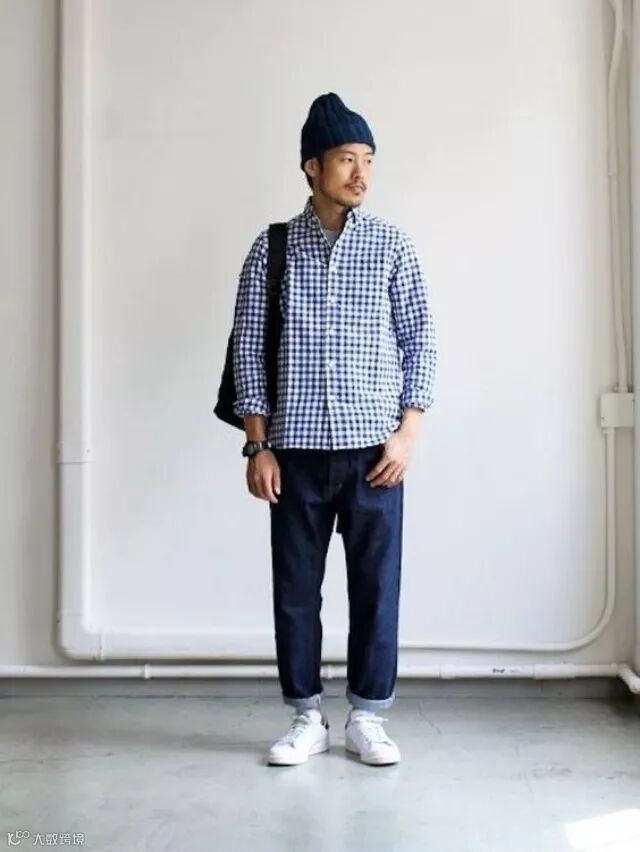 这套则是上面几套穿搭的小元素合集:叠穿、牛仔裤卷边、布包、白色板鞋,这个Look也经常被工装狂魔余文乐所pick。