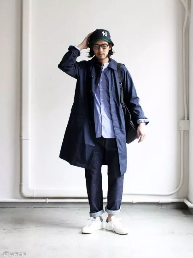 水洗材质衬衫搭配风衣,卷边牛仔裤和白色板鞋,整体依然是一个主色调,藏青色也适合商务场合,清新而不随意的气质当然是非常加分的。
