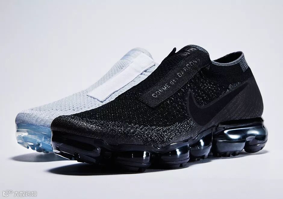 Nike Air VaporMax 早前和 COMME des GARCONS 合作,保留袜套式概念,进一步舍弃鞋带,并以印有 COMME des GARCONS 品牌字样的布条覆盖于原鞋带孔处。