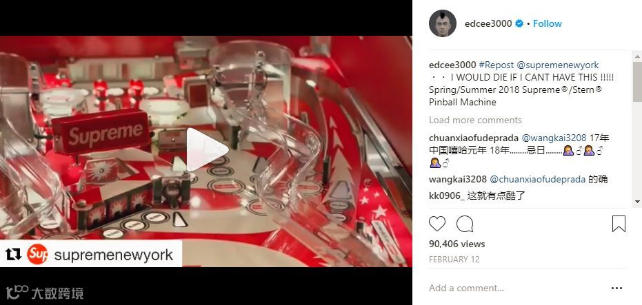 这款弹珠机应该是 Supreme 18ss 最重磅的单品之一,在众多 Supreme 爱好者的翘首期盼中,超限量的弹珠机终于在 2018 Week 14(5/24号)发售了,发售数量全球仅有200台,但扣除公关用途的数量后,实际对外贩售的只有100 台,然而现在市面上最后只剩下2、30 台,加上它本身是博弈类型的电动,所以只在欧美地区贩售,这也是为什么这个弹珠机能够在网络上叫价超过40 万的原因之一。