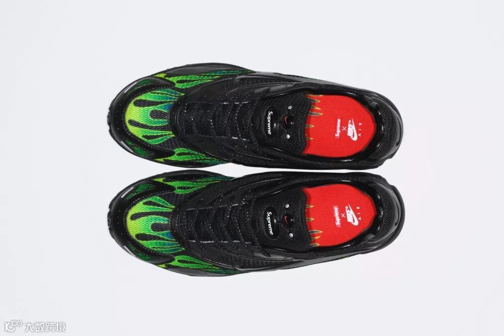 鞋舌和后跟是用 Supreme Logo 和 3M 反光「地球」图案作点缀,最后海搭载大红色的鞋垫、Phylon 中底和 TPU 足中支撑贴片而成。