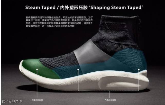 ▲内外塑形压胶技术,鞋头的外压胶为鞋款更好的解决了针织鞋面的防水问题▲