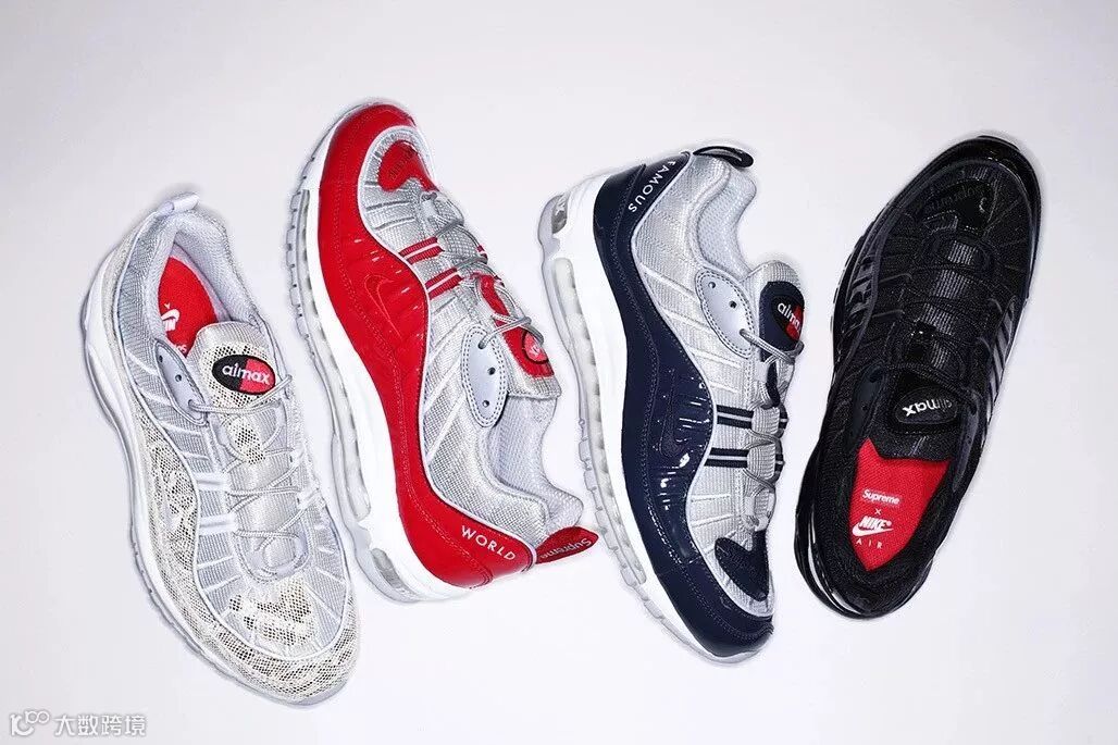 Supreme X Nike Air Max 98 共推出黑、白、红、蓝 4 种配色,相较于原版的朴实还加入了蟒蛇纹理、反光饰条、「World Famous」精神标语、SUPREME LOGO 等元素后,一双好鞋重获新生。