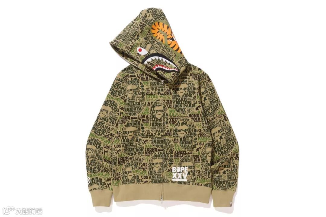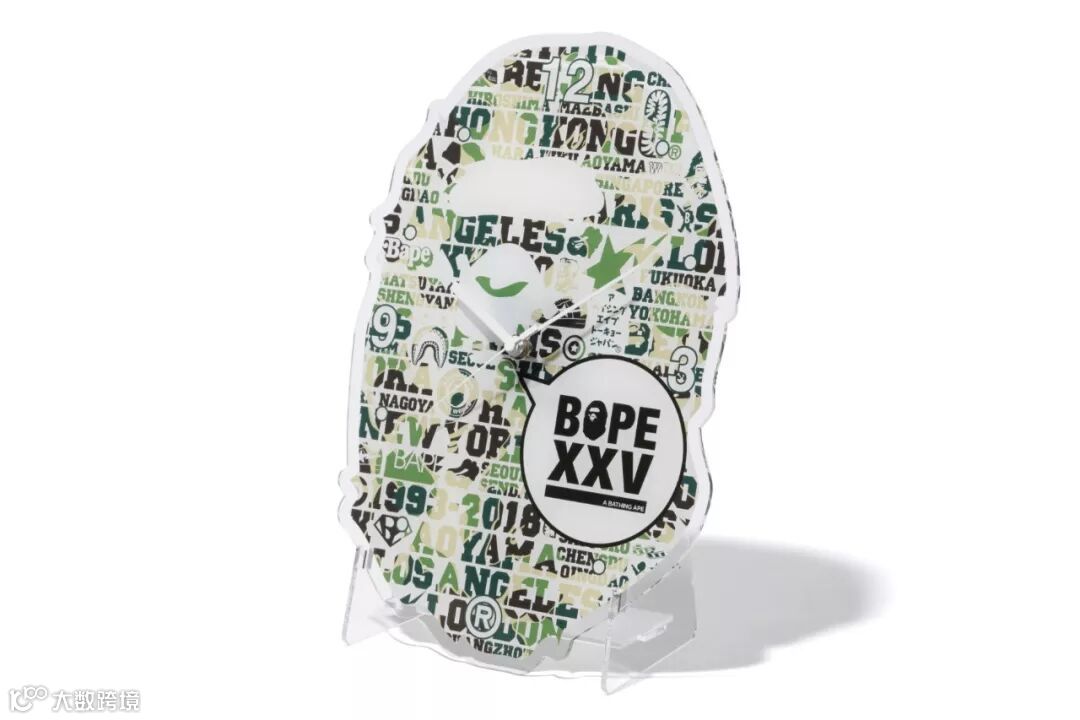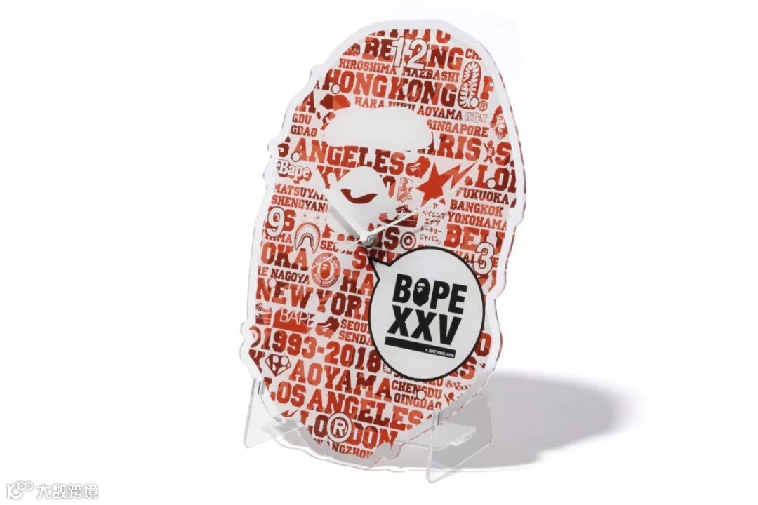 而今年已经是品牌创立第25年,这次以「BAPE XXV」来企划,特别设计出新猿颜迷彩「BAPE® CITIES CAMO」,将不同BAPE® 的代表图案和地点注入在内演变出来,更以四种配色去演绎整个系列包括T-Shirt,卫衣、挂墙时钟、钥匙扣及手机保护贴。