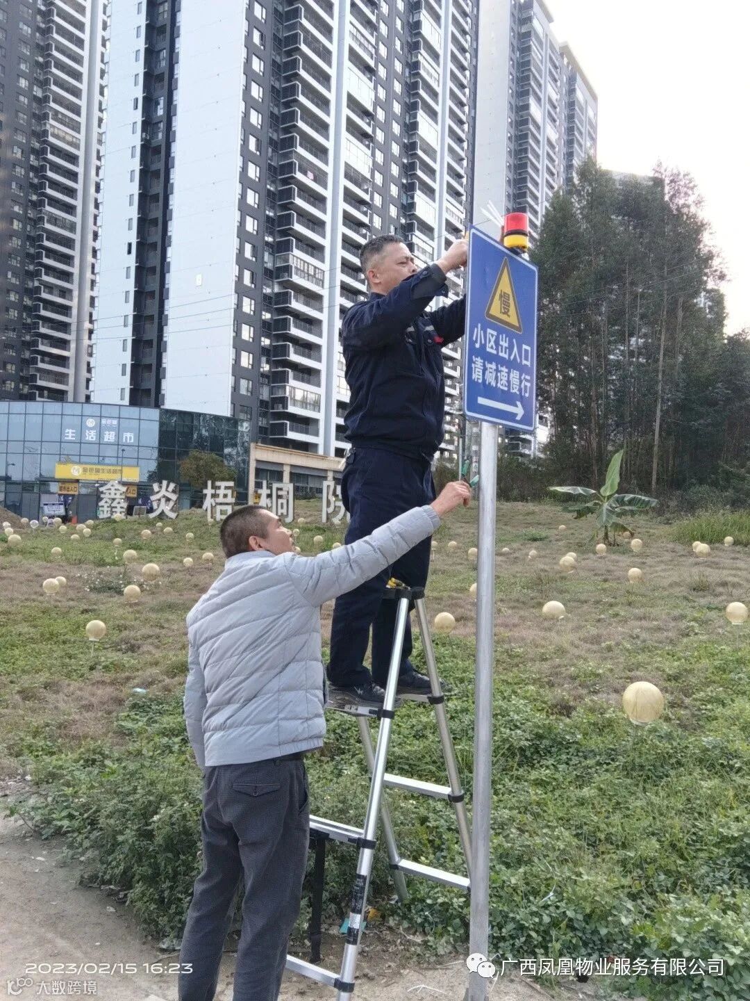 在小区出入口的“减速慢行”标识上安装警示灯,为业主的安全出行增加一道防护线。
