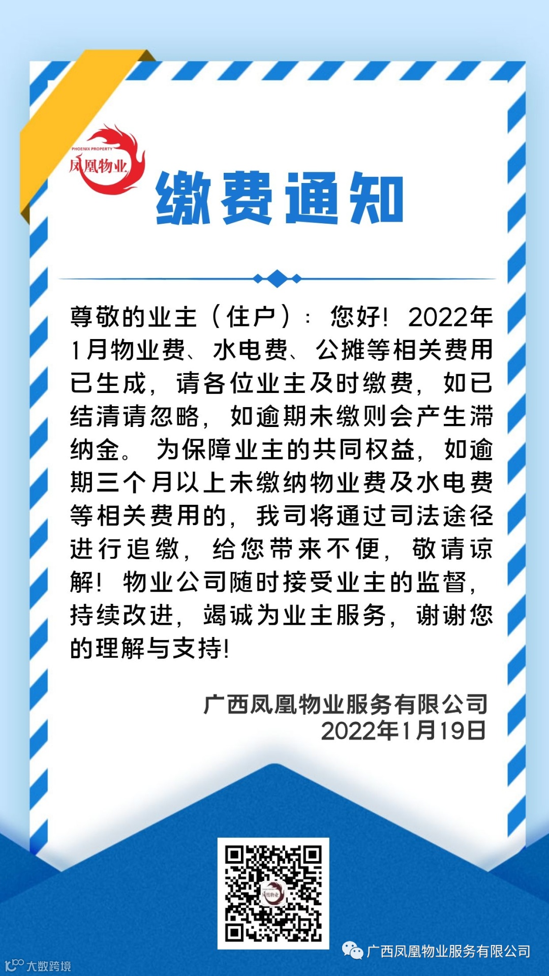 关注广西凤凰物业服务有限公司微信公众号,您可以接收到最新的物业通知,更可查询、缴纳每个月的物业服务费用,发布投诉建议,对物业中心的投诉处理结果做出评论!扫描上方二维码,立即关注我们吧!