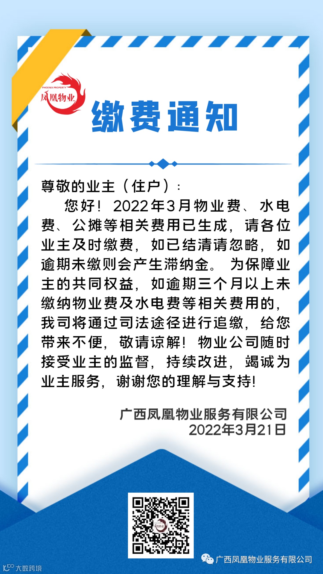 关注广西凤凰物业服务有限公司微信公众号,您可以接收到最新的物业通知,更可查询、缴纳每个月的物业服务费用,发布投诉建议,对物业中心的投诉处理结果做出评论!扫描上方二维码,立即关注我们吧!