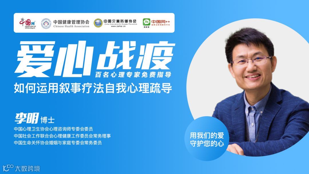 在中国互联网新闻中心 、中国健康管理协会、中国灾害防御协会的指导下,网家家APP推出大型疫情防控心理知识系列主题直播暨专家在线答疑指导活动“爱心战疫”,全力狙击“新冠肺炎”!百名心理专家免费在线指导答疑,从心理学的视角为大家,科普新冠肺炎的心理学防疫知识,更有爱心特群24小时鼎力加持,靶向瞄准、精准阻击新冠肺炎!3月19日,我们将会邀请到中国心理卫生协会心理咨询师专委会委员、中国社会工作联合会心理健康工作委员会常务理事、中国生命关怀协会婚姻与家庭专委会常务委员李明博士,与大家分享《如何运用叙事疗法自我心理疏导》的话题。他将为我们介绍叙事疗法的六个可以指导自我心理疏导的原则和方法。敬请关注!