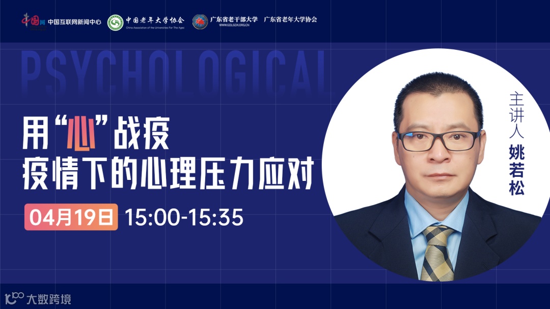 4月19日,我们将会邀请到广东省老干部大学任课教师、广州大学教育学院教授、博士生导师姚若松老师针对老年人的心理压力,分析心理压力的来源,制订应对心理压力的措施。以心理学的知识,守护您的心。敬请关注!