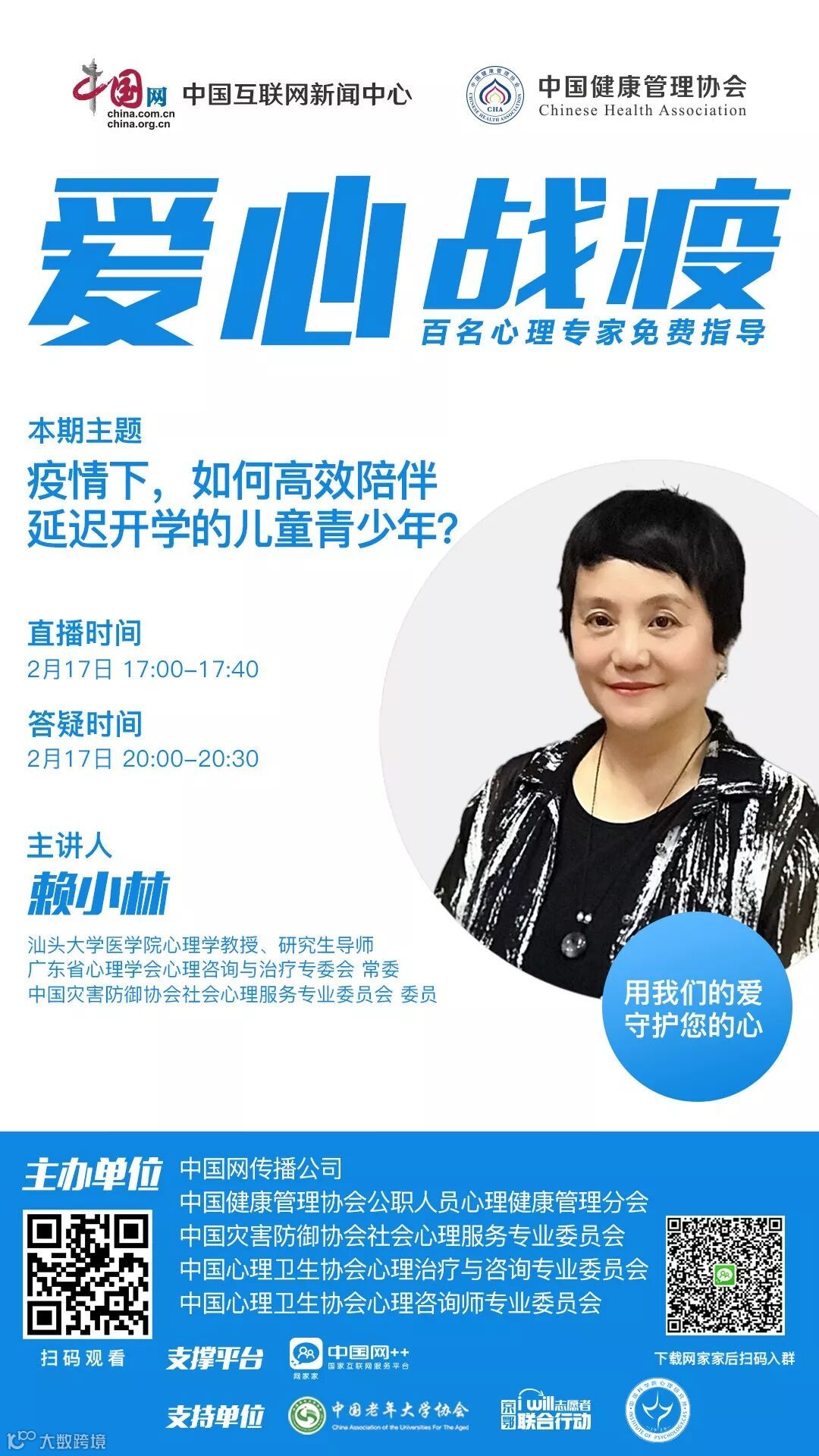 网家家APP推出大型疫情防控心理知识系列主题直播暨专家在线答疑指导活动“爱心战疫”,全力狙击“新冠肺炎”!百名心理专家免费在线指导答疑,从心理学的视角为大家,科普新冠肺炎的心理学防疫知识,更有爱心特群24小时鼎力加持,靶向瞄准、精准阻击新冠肺炎!本期邀请到汕头大学医学院心理学教授、研究生导师、中国灾害防御协会社会心理服务专业委员会委员赖小林教授为我们剖析疫情下不同年龄阶段儿童青少年的心理特点,以及提供针对性有效陪伴的操作方法技巧。