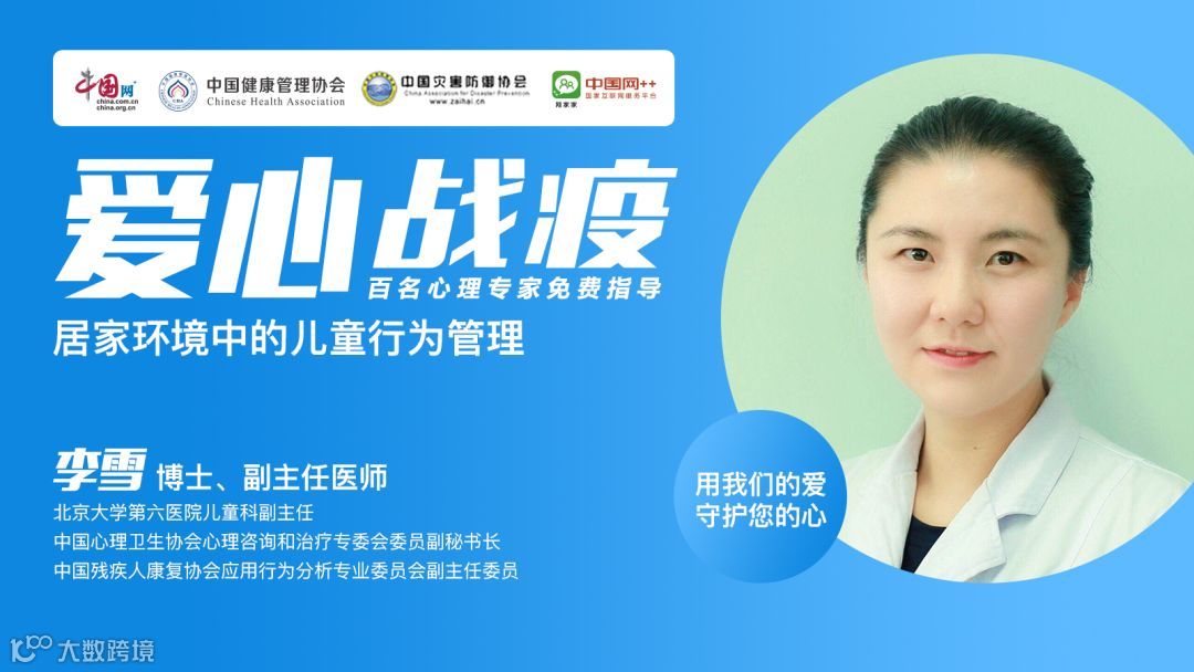 在中国互联网新闻中心 、中国健康管理协会、中国灾害防御协会的指导下,网家家APP推出大型疫情防控心理知识系列主题直播暨专家在线答疑指导活动“爱心战疫”,全力狙击“新冠肺炎”!百名心理专家免费在线指导答疑,从心理学的视角为大家,科普新冠肺炎的心理学防疫知识,更有爱心特群24小时鼎力加持,靶向瞄准、精准阻击新冠肺炎!3月25日,我们将会邀请到北京大学第六医院儿科副主任、中国心理卫生协会心理咨询和治疗专委会委员副秘书长、中国残疾人康复协会应用行为分析专业委员会副主任委员李雪博士,与大家分享《居家环境中的儿童行为管理》的话题。她将运用科学有效的心理学知识,帮助家长与孩子一起做好复学前的准备工作。敬请关注!
