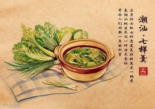 潮汕地区初七要吃七样羹。七样羹是指:大(芥)菜、厚合、芹菜、蒜、春菜、韭菜、芥兰”等蔬菜同煮,寄寓“新(芹)春发(蒜)大财(大菜),久(韭)合各人(芥兰)。——百度百科。实际上,现在大都不会这么讲究了,一般凑齐七种蔬菜就行啦!