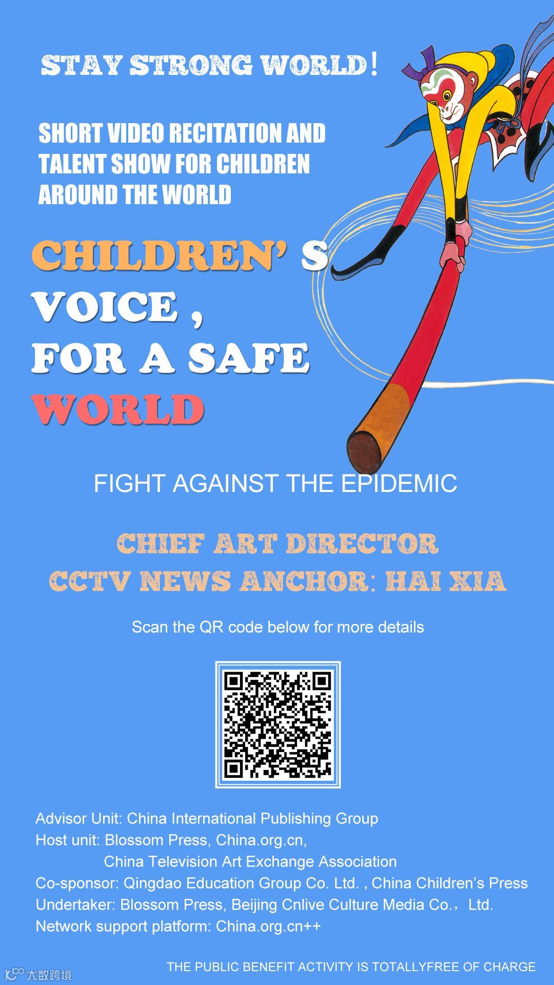 为团结一心抗击新冠肺炎,倡导敬畏自然、珍爱生命,经紧急筹划,朝华出版社联合中国网传播公司和中国电视艺术交流协会主办,青岛广电教育集团和《中国少年儿童》杂志社协办,在2月16日正式发起了“童声共济 平安中国”海内外少年儿童短视频朗诵公益活动。
