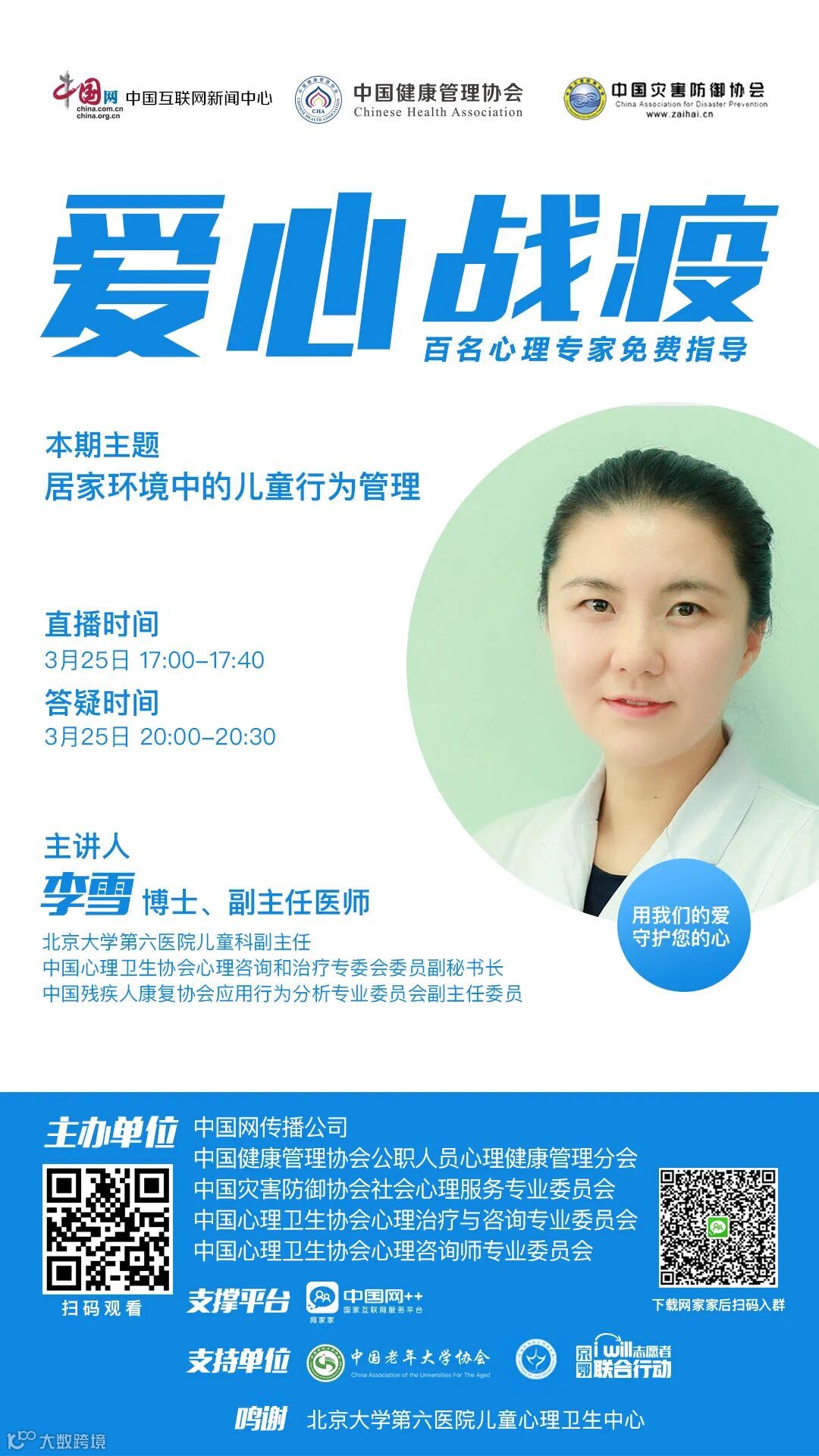 在中国互联网新闻中心 、中国健康管理协会、中国灾害防御协会的指导下,网家家APP推出大型疫情防控心理知识系列主题直播暨专家在线答疑指导活动“爱心战疫”,全力狙击“新冠肺炎”!百名心理专家免费在线指导答疑,从心理学的视角为大家,科普新冠肺炎的心理学防疫知识,更有爱心特群24小时鼎力加持,靶向瞄准、精准阻击新冠肺炎!本期邀请到北京大学第六医院儿科副主任、中国心理卫生协会心理咨询和治疗专委会委员副秘书长、中国残疾人康复协会应用行为分析专业委员会副主任委员李雪博士运用科学有效的心理学知识,帮助家长与孩子一起做好复学前的准备工作。